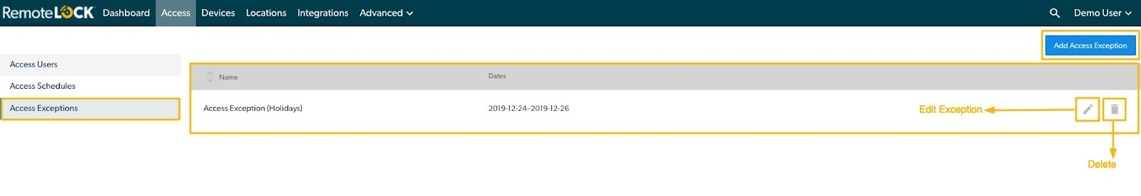 After an Exception has been created, it can be edited or deleted from the Access Exceptions tab.