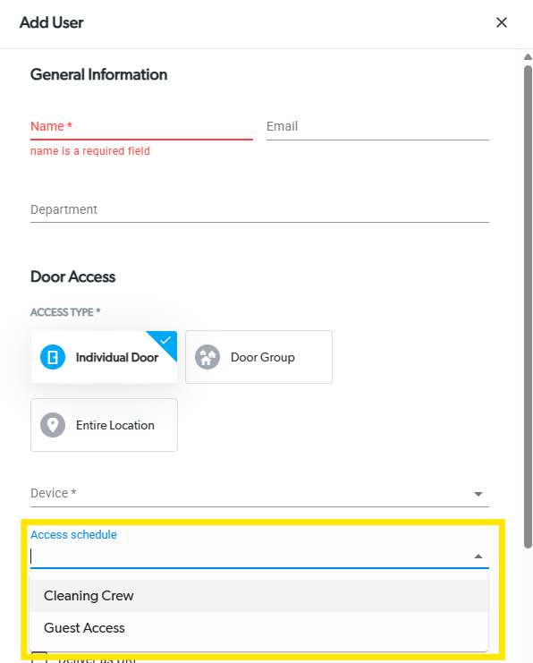 - To add an Access Schedule when creating a Guest or User for the first time, you can select the Access Schedule Drop Down list in the creation window to apply your Access Schedule to your Guest for their device.