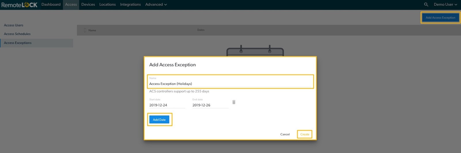 Information on creating Access Exception schedules and adding them to an Access Schedule is below.