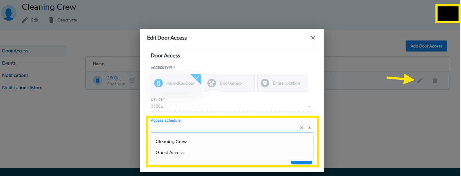 - If you already have a Guest or User that exists in the RemoteLock Web Portal, you can select that Guest/User in the Access Tab, then edit their Access Schedules by selecting the Pencil Icon to the right of the device that you wish to assign this access schedule to.