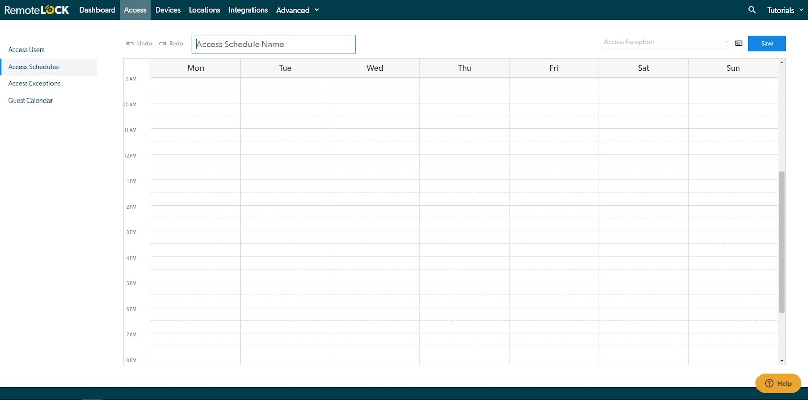 For example, an employer may create a schedule for Monday - Friday from 9 AM to 5 PM each day. Selecting this schedule for the Access User would send this schedule to the lock as part of their credential. When this user's pin number is entered on the lock, the door will only unlock if within the parameters of the schedule.