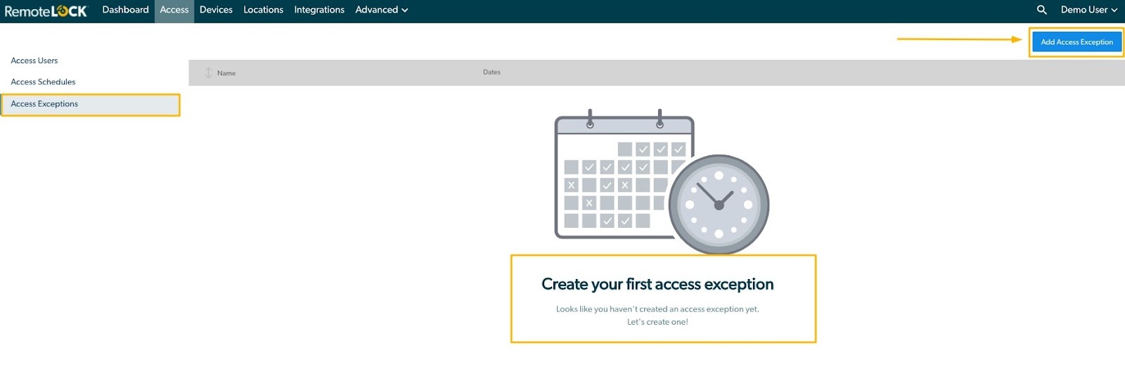 - Select the Access Exception tab. This tab shows a list of all existing schedules that have been created in the account, the option to edit them and create new Exception Schedules.